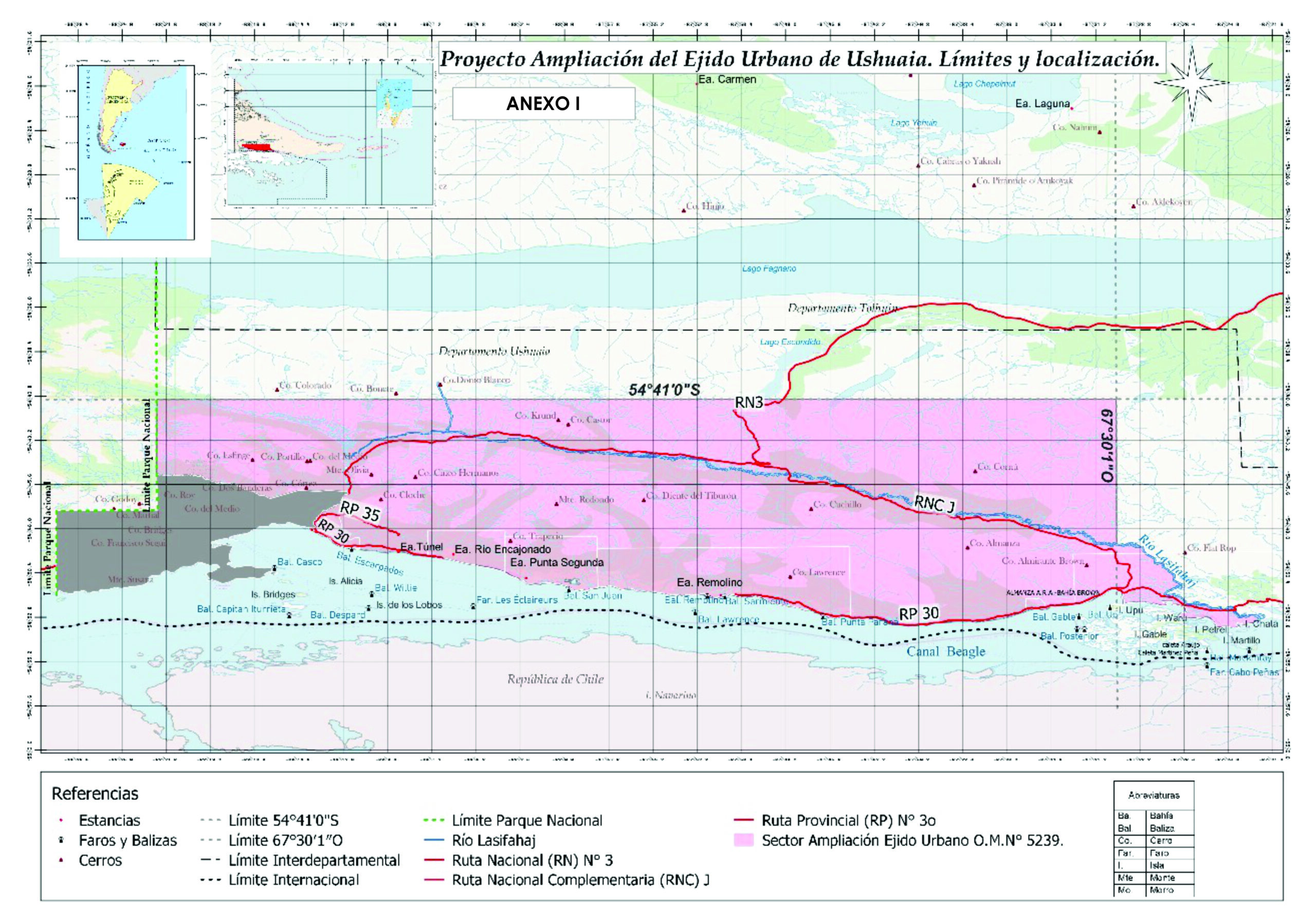 ARTÍCULO 1º.- AMPLÍASE el ejido urbano de la ciudad de Ushuaia el que quedara determinados por las siguientes coordenadas, de acuerdo al gráfico que obra como Anexo I, II y III de la presente:
